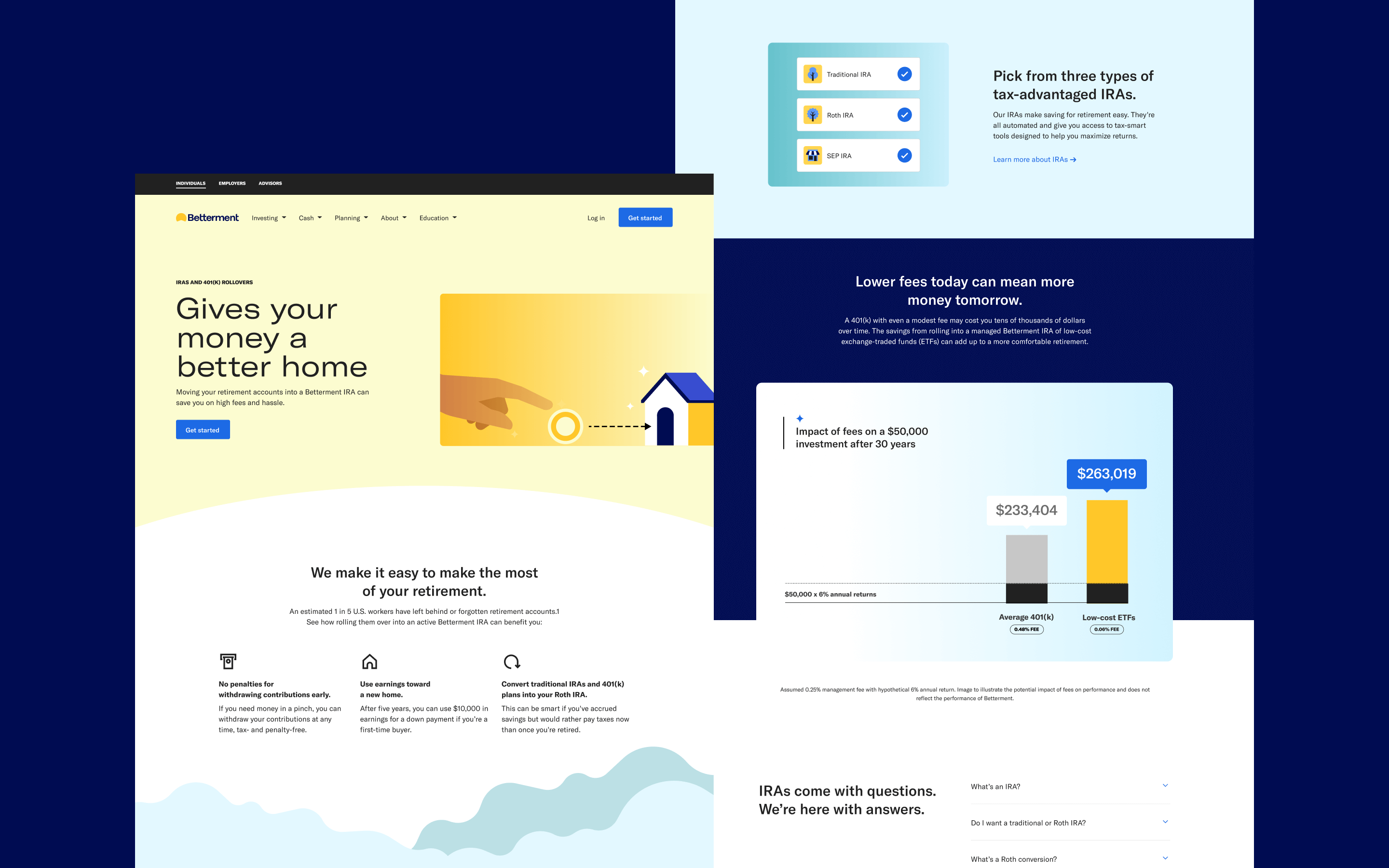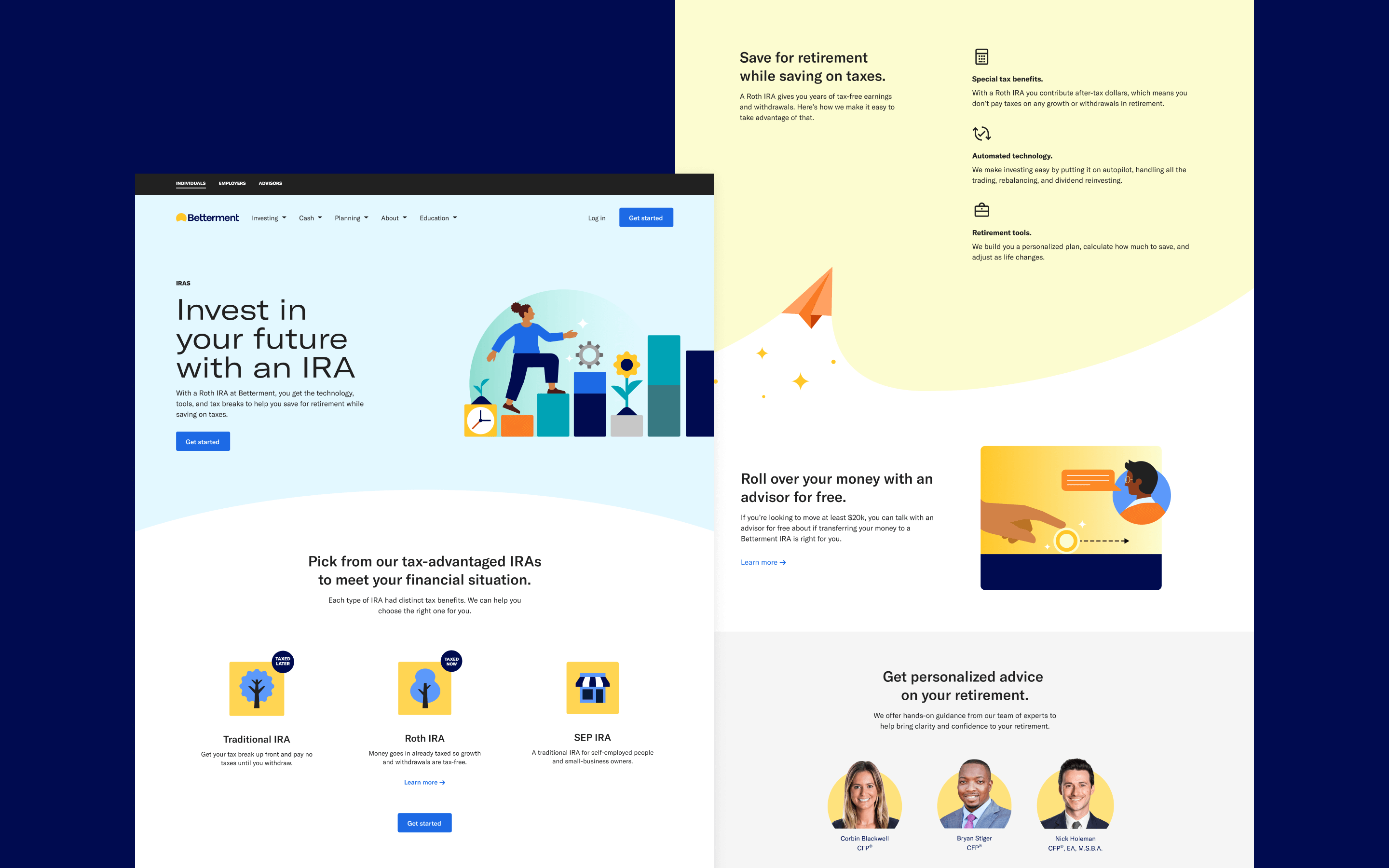 Our research revealed that many prospects lacked a clear understanding of retirement and needed more education. We created content-rich pages tailored to user intent: IRA, Roth IRA, and Rollover pages provided detailed explanations and persuasive charts for high-intent prospects, while the Retirement Planning page used lighter, aspirational design and visuals to engage those still exploring.
