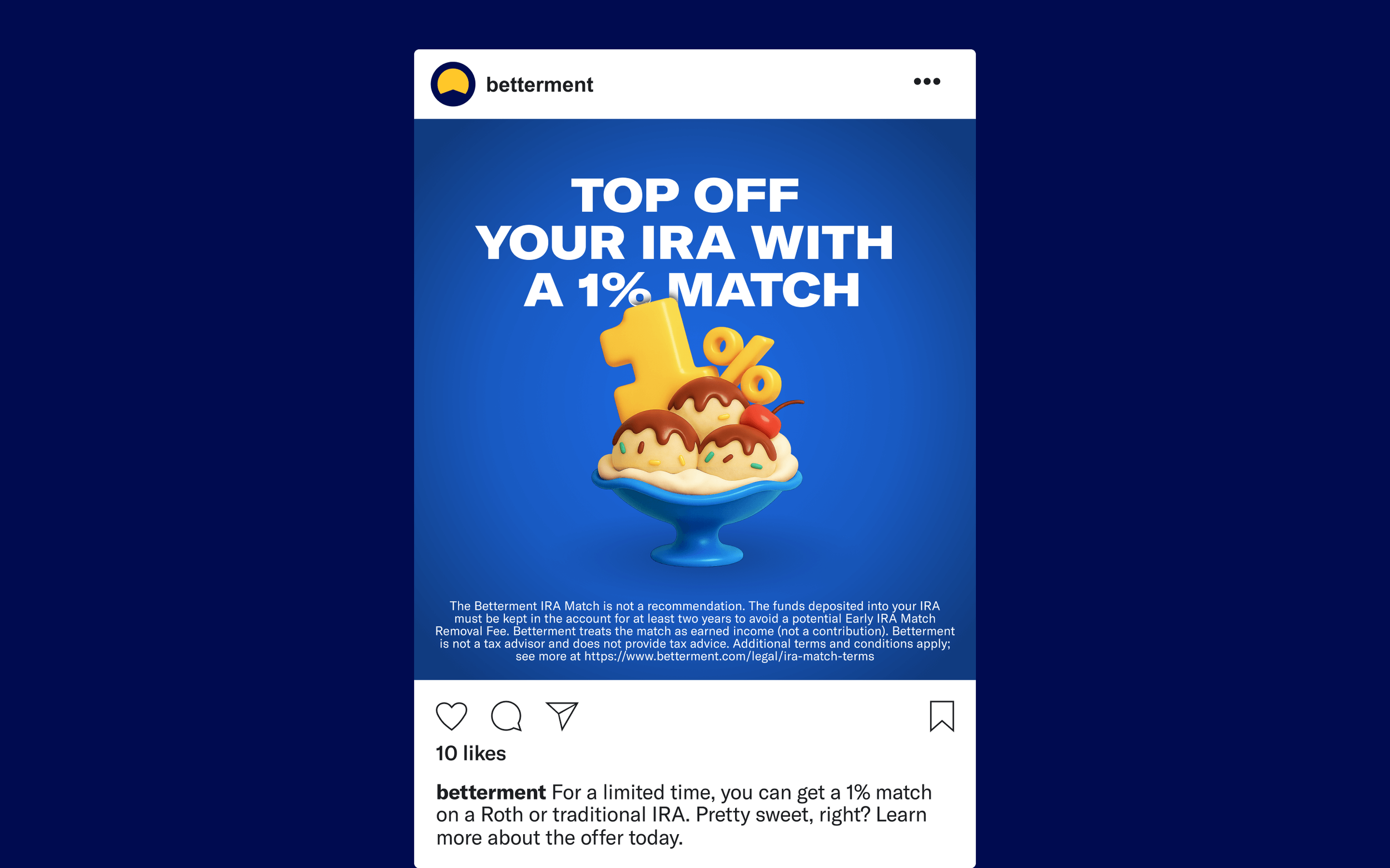 To encourage people to open an IRA with Betterment, we ran a 1% match promotion on new contributions. While our match wasn’t the highest on the market, we used it as a chance to get creative, crafting a digital campaign with eye-catching visuals and playful language that highlighted the match percentage.